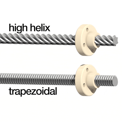 Here, you can see clearly that the pitch of the single-pitch trapezoidal lead screw is less than that of the high helix lead screw. The coefficient of friction of the two lead screw nuts is identical to those of the stainless steel lead screws. As described above, the lower pitch means that the lead screw nut cannot move without external help.