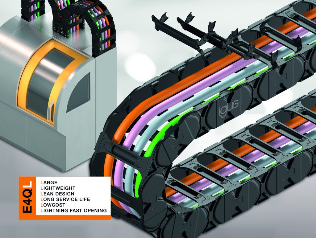 07 August 2023 – igus®, the world leader in motion plastics and moving cable management systems, has added a new addition to its cable carrier product portfolio: the E4Q, a globally proven e-chain® for applications with long cantilever lengths and high fill weights, is now available as an “L” version. With the E4Q.64L, users for whom the E4Q was previously oversized can save up to 20 percent in costs. They still benefit from the advantages of the larger brother model – such as the fast, tool-free opening.
