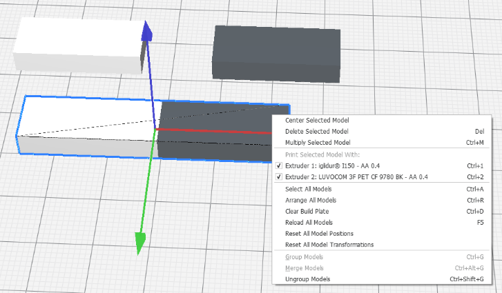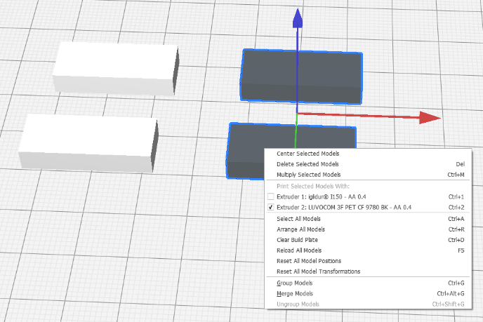Cura offers the possibility to superimpose STL models. Here, two models are combined in such a way that their coordinate systems and origins match. Furthermore, materials can be individually assigned to the models. A 2-component part requires two STL models that belong together and to which the respective material is assigned.