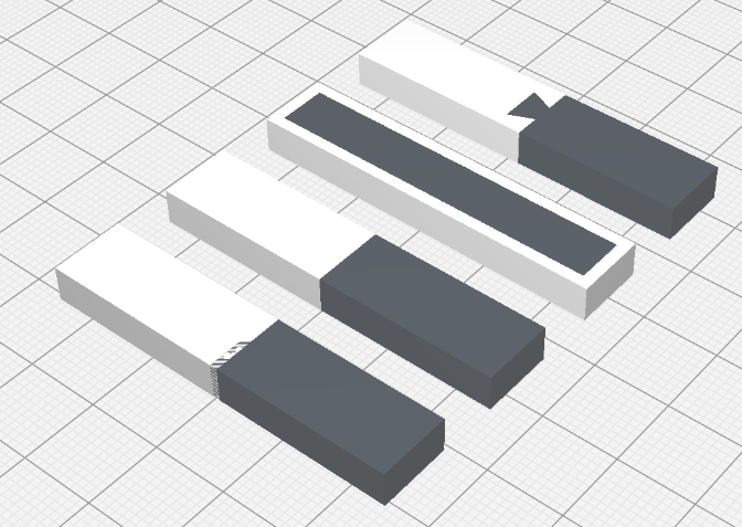 As already mentioned, a connection between two materials in a component can be made with a positive fit and a material bonding. A positive-locking connection is of course also a material-locking connection, but offers greater security against failure. In the following some examples of positive fit and material bonding connections using suitable design and implementation with Cura are shown. The simplest material bonding connection is the direct joint without overlap. Positive-locking connections can be created by a dovetail, for example – however, there are practically no limits to the design, and often the geometry is determined by the application anyway.