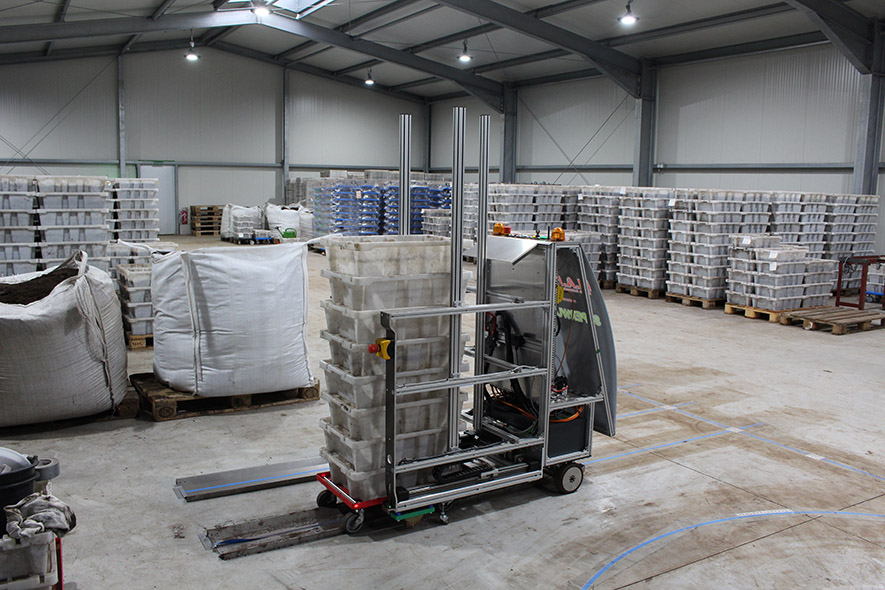 Looking to enhance his technology even further, Langhoff developed machines to fully automate the feeding and watering process. Two robots, a conveyor belt and an AGV now take care of monotonous feeding and watering steps that previously had to be done by personnel.