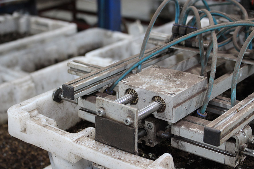 The first machine that Langhoff engineered was for feeding the worms and watering the soil. The unit needed to work around the clock and function reliably while exposed to moisture and debris. No external lubrication could be present so that the worms and soil remain uncontaminated.