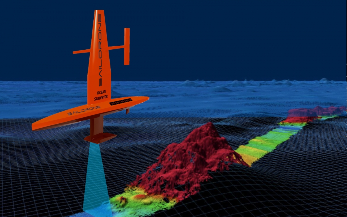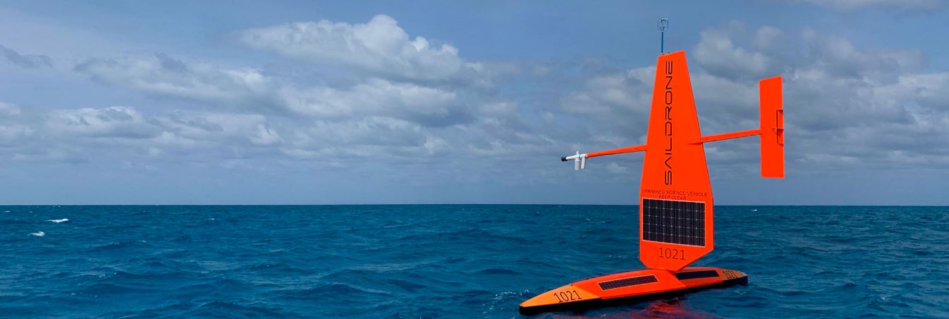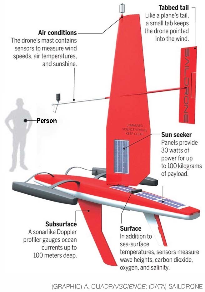 Saildrone, a company based in California, designs, manufactures, and operates a global fleet of wind and solar-powered ocean drones that monitor the state of the planet in real-time. The drones are powered with a propulsion system and include a tall, hard wing, a longitudinal spar and a vertical tail. A trim-tab on the tail adjusts the wing angle to the wind, similar to the way an elevator trim tab controls the pitch of an aircraft.
