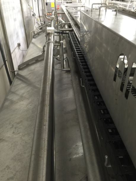 The energy chain in the application worked on the carriage of an enclosed finishing vat. The vat took cheese curd and whey slurry from a cheese vat, removed the whey, salted the cheese and blew the curd to a packaging room for bulk filling.