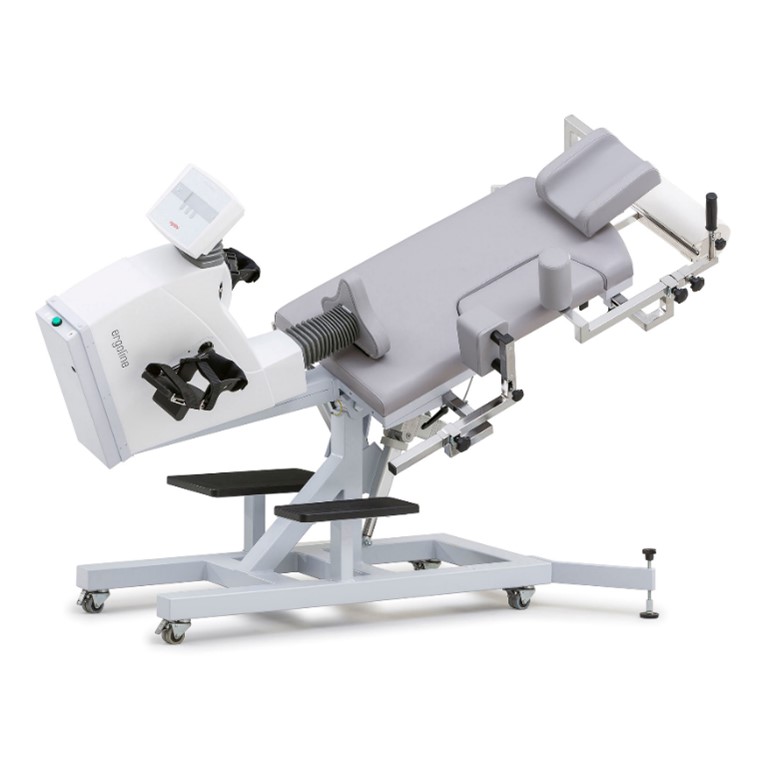 The ergoselect 1200 is a specialized reclining ergometer developed by ergoline. This newest device was designed for a particular heart examination called a dynamic stress echocardiography. The device's inclination angle can be electrically adjusted horizontally and laterally between 0 and 45 degrees, allowing special ultrasound heart examinations during an ergometric stress test.