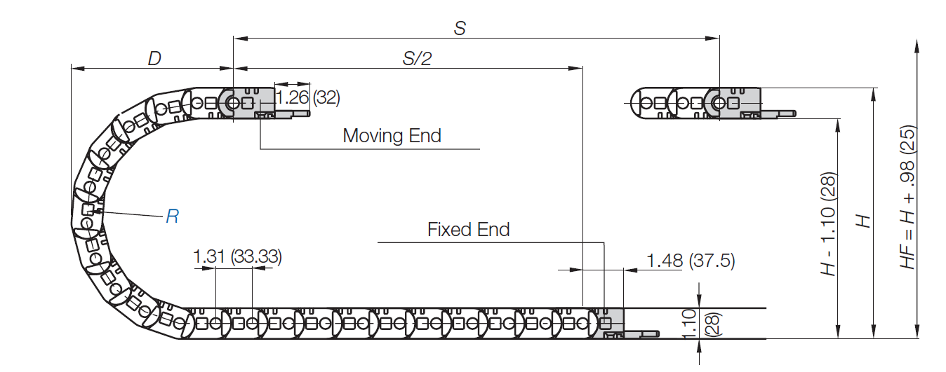 The two common configurations of energy chain systems are unsupported short travel and long travel gliding. Unsupported short travel is just what is sounds like -- the travel is short, usually under 30 feet, and the cable management system requires no support. It is strong enough to support itself and the fill weight for a specified travel distance. Every cable carrier has a maximum amount of unsupported travel distance relative to its fill weight. Moving past this limit will require a larger, stronger cable carrier or utilizing a configuration called “long travel gliding.” This configuration is commonly used in Bulk Handling and Mining applications with a travel distance ranging from 30 feet up to a few thousand feet.