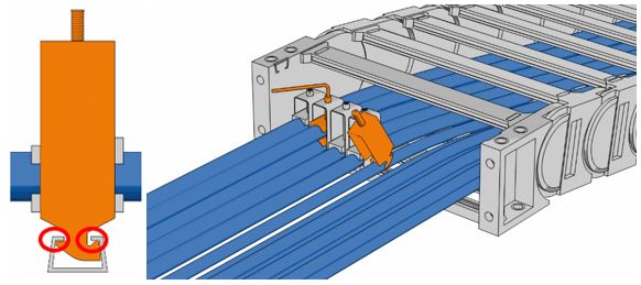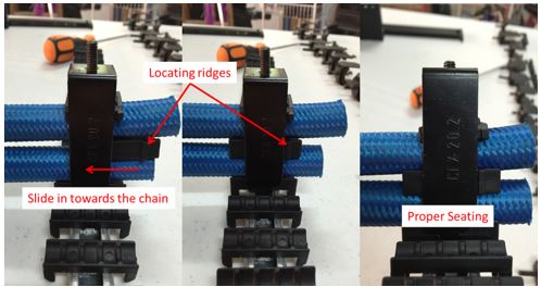 Why is the strain relief system so important you may ask? Simply put, improper strain relieving can lead to the premature wear of the cables and hoses as well as cause other conditions which could adversely affect the performance of the energy chain system. Cable jacketing flat spots, jacket bunching, or exposed conductors are all good indicators that there is a cable tension issue present.