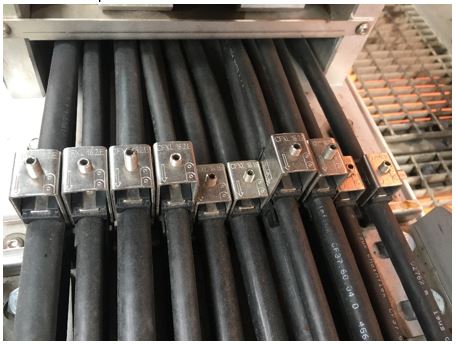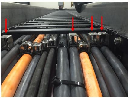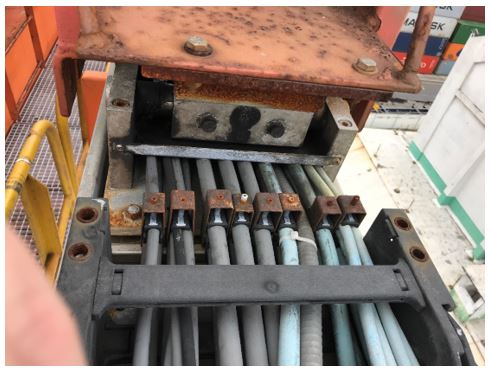 Most crane applications will have two types of strain relief clamps – single cable or double stacked. Single cable clamps have one base saddle that clips into the profile rail. Double stack cable clamps will have one base saddle + a middle saddle. Missing saddles on either of these clamp styles could create cable ‘hotspots’ where accelerated jacket wear is observed. Missing bottom saddles can result in cable shorts and crushed jackets and missing middle saddles compromise the holding force of the clamps.