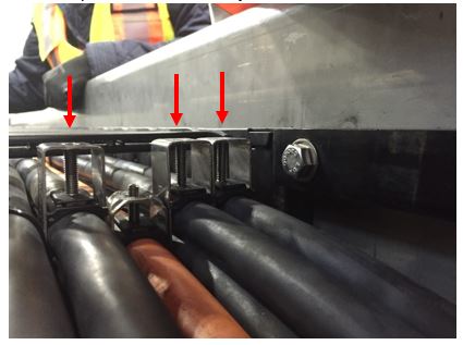 This instance is observed less frequently since the damage is typically already done by the time we’ve arrived. This only applies to clamps installed on the fixed end of chain where the upper run of chain will pass over. A clamp that is too tall will catch the gliding, upper run of chain – ripping out the clamp and potentially causing damage to the chain and surrounding cables. As a rule of thumb, there should be ample space between the set screw/clamp housing and crossbar. The picture below shows that the clamps are almost flush with the top of the crossbar – way too close for comfort.