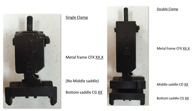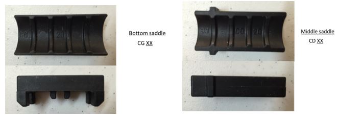 If you take a close look at the middle saddle pictured above, you will notice a ridge that secures the middle saddle in place. This prevents the saddle from pulling through the clamp. When installed, this middle saddle should slide between two cables towards the chain, with the ridge making contact with the metal clamp housing. See the illustration below for a great depiction of how these middle saddles should be oriented