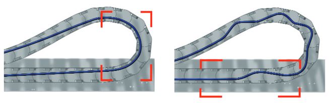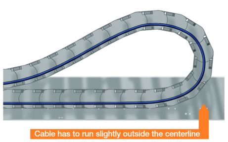 Pictured left, cable is pulling tightly against the inner radius. On the right, the cable is too loose within the energy chain.