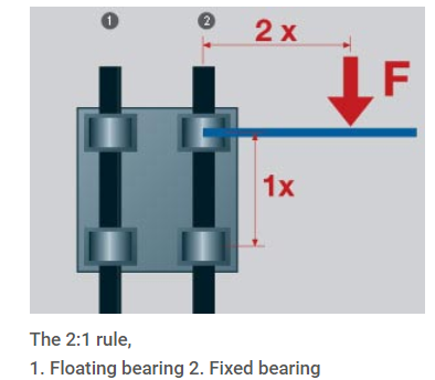 Due to the higher coefficient of friction, polymer linear plain bearings must follow the "2:1 Rule": No acting force can be further than twice the overall distance between bearings on one rail, or binding will occur. This principle is one of the first things our technical sales team considers when working on a new project. For new designs, this is usually solved by spacing the bearings out further along the rails and making sure that the guide rail closest to the drive force uses fixed bearings while the other rail uses floating bearings. Click here to read a tech-talk on the subject with more information.