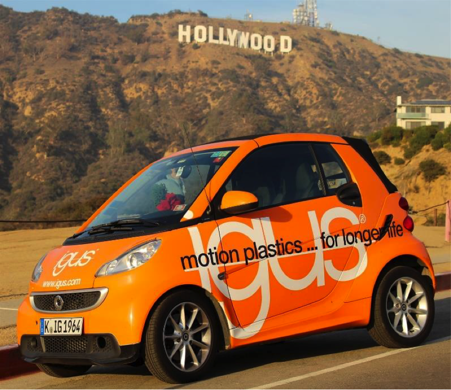 Affectionately named “Clementine” by its drivers and outfitted with plastic automotive components in brake pedals, windshield wipers, door hinges, seat adjustment controls, headlight pivots, throttle valves as well as gear wheels and roof actuators, the little orange vehicle served as a durable, self-lubricating, corrosion-free and cost-effective prototype at the Auto Expo in India, Japan, South Korea, Taiwan, Brazil, Canada and the U.S., not to mention the majority of European countries. The 2015 Hannover Messe concluded the European adventure of the orange sprinter, sending iglide’s 30th birthday message to everyone who encountered the plastic charmer and its dedicated team. When disassembled for thorough inspection of the retrofitted applications, the numerous iglide® components showed hardly any signs of wear, proving igus®’s concept of plastics for longer (service) life!