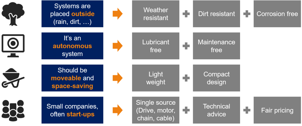 Many companies that are currently establishing themselves in the drone-in-a-box market are start-ups. Those types of small businesses typically have limited personnel structure and manpower. With a very broad portfolio, igus® offers companies the opportunity to get many products and the associated advice from a single source. igus® can supply motors, linear drives, controls, cables and cable carriers that are coordinated with one another. This saves a start-up massive coordination capacities and interface management.