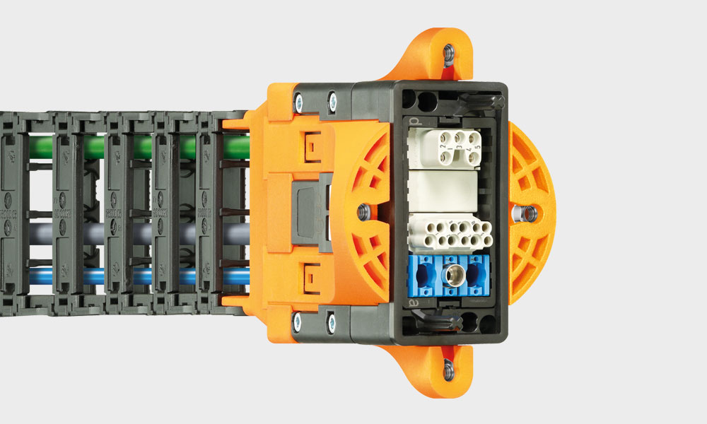 The adapter is designed to connect the Module Connect interface concept and the energy chain to a coherent system. It is a further step towards the plug-and-play e-chain. Depending on the chain series, chain width and number of modules, the Module Connect is connected to the energy chain by an individually designed component.
