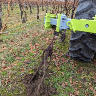 Thiessen Tillage of Canada has invented a toolbar for pulling vines or small trees out of vineyards and orchards that mounts to either the front or rear of a tractor.