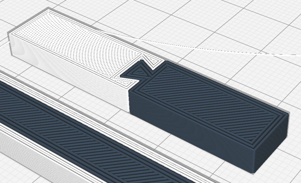 As already mentioned, a connection between two materials in a component can be made with a positive fit and a material bonding. A positive-locking connection is of course also a material-locking connection, but offers greater security against failure. In the following some examples of positive fit and material bonding connections using suitable design and implementation with Cura are shown. The simplest material bonding connection is the direct joint without overlap. Positive-locking connections can be created by a dovetail, for example – however, there are practically no limits to the design, and often the geometry is determined by the application anyway.